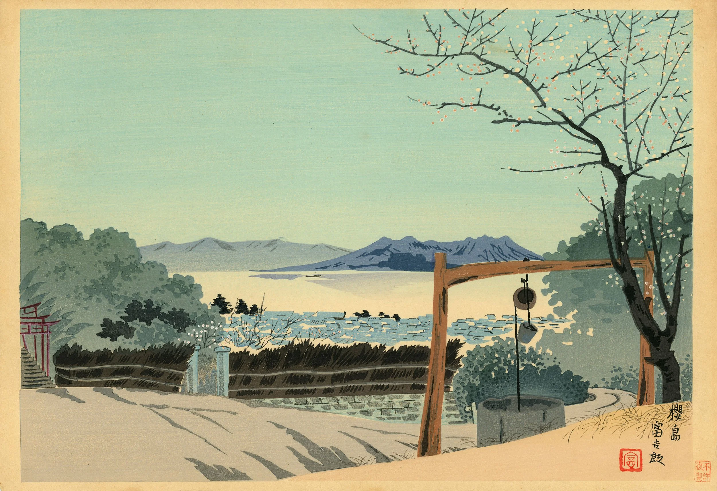 Print artist. Tokuriki was born in Kyoto, where he has always worked. The last of a long line of traditional-style painters, he turned early to woodblock prints and became a leader of the Kyoto ‘Sosaku Hanga’. He graduated from the Kyoto City School of Fine Arts and Crafts and then from the Kyoto City Specialist School of Painting in 1924. In 1928 he studied ‘Nihonga’ painting under Tsuchida Bakusen (1887-1936) and Yamamoto Shunkyo (1871-1933) and exhibited with Kokuga Sosaku Kyokai, but about the same time in 1929 he changed to woodblock printing under the influence of Hiratsuka Un’ichi and began to contribute to the early print magazine ‘Han’. He was a member of Nihon Hanga Kyokai from 1932, and active in promoting ‘Sosaku Hanga’ in Kyoto. He was a co-founder of the Kyoto magazine ‘Taishu hanga’ in 1932, which helped create the sense of a local school of the Creative Print Movement much encouraged by Hiratsuka. He produced many sets of prints before and during the Pacific War based on traditional subjects, such as ‘Shin Kyoto fukei’ (‘New View of Kyoto’, 1933-4), which also included designs by Asada Benji (q.v.) and Asano Takeji (b.1900), and ‘Tokyo hakkei’ (‘Eight Views of Tokyo’, 1942). Most of these were published by Uchida of Kyoto, but after the war Tokuriki set up his own publishing company called Matsukyu, which also began to teach block-carving to artisans and artists, in later years many of them foreigners. In 1948 he also set up a sub-company called Koryokusha consisting of artists who would produce their prints under the financial umbrella of Matsukyu. Later sets include ‘Hanga Kyoto hyakkei’ (‘One Hundred Print Views of Kyoto’, 1975). Tokuriki has continued to be active in teaching and writing, producing a long series of articles on print techniques in ‘Hanga geijutsu’ magazine during the 1970s.